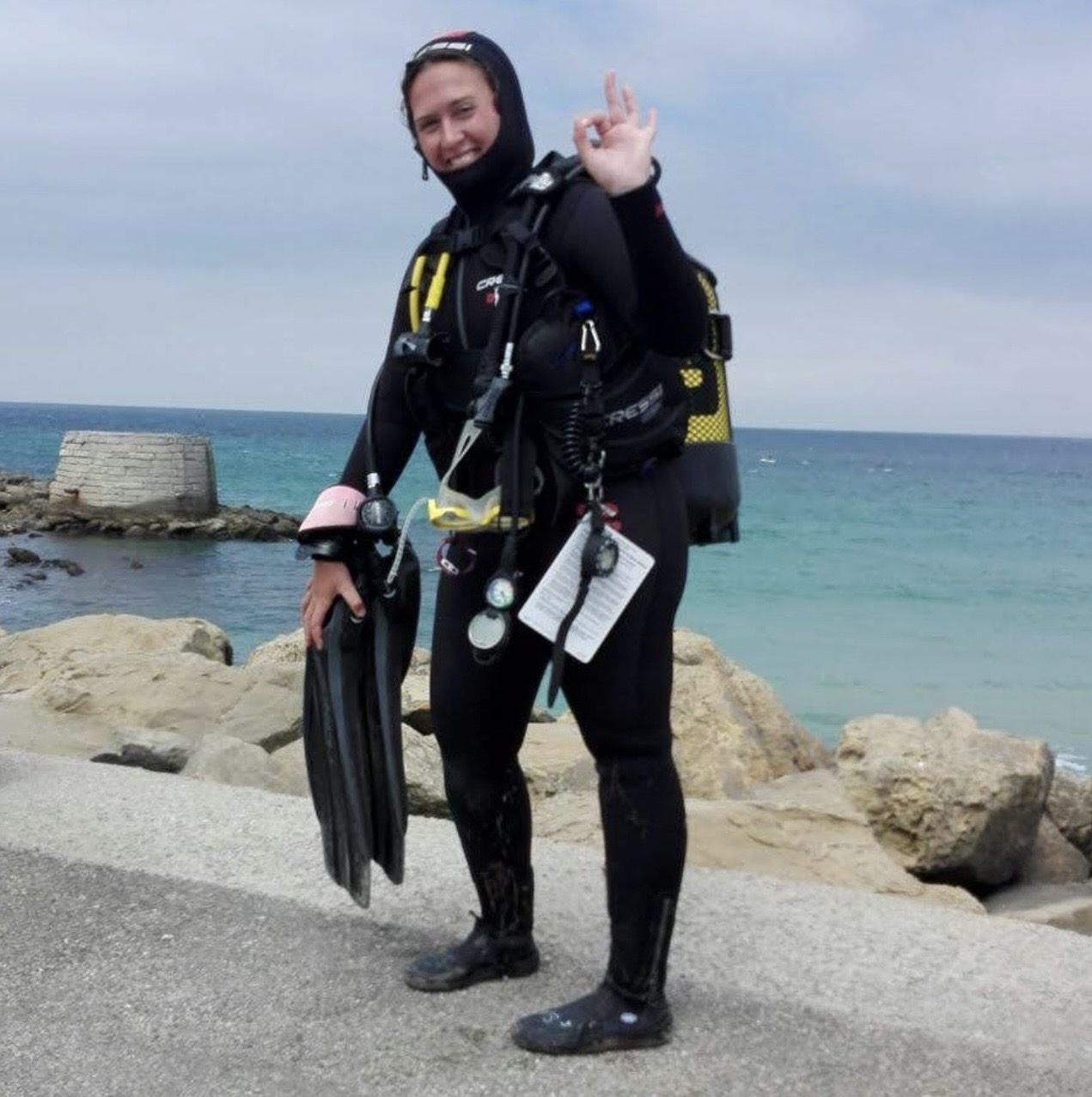 Mientras terminaba sus estudios en Administración y Turismo, empezó con el buceo en Barbate, Cádiz. Y, justo después de la graduación, en 2015, marchó para Lanzarote, donde se formó como instructora de buceo a la vez que trabajaba de recepcionista en un hotel.